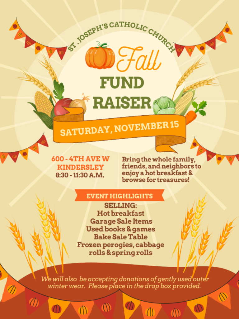 Kindersley St. Joseph's Catholic Church annual fall fundraiser will be held in the parish hall from 8:30 - 11:30 a.m. Come out for a hot break-fast of pancakes, sausages & scrambled eggs. Items for sale include Garage sale items, bake sale table, used books & games. Frozen cabbage rolls, perogies and spring rolls can be purchased as well from the kitchen. We are also taking donations of good used winter outerwear to be disbursed to those in need. 600 4th Ave West in Kindersley. Everyone welcome!