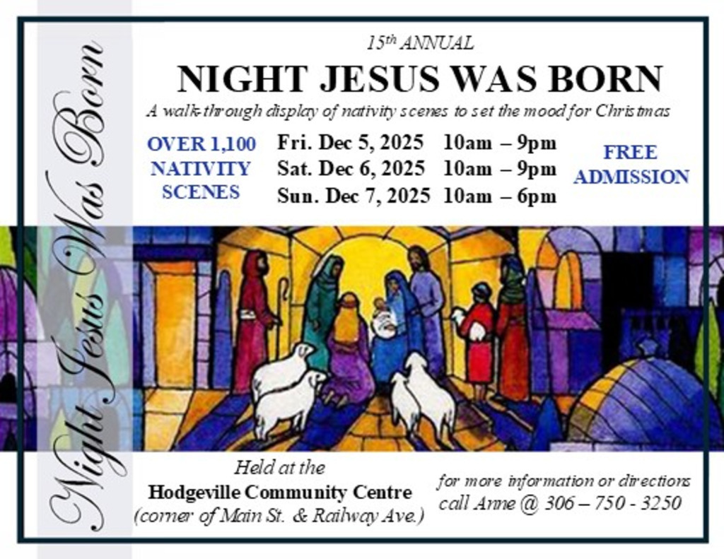 You are invited to come walk through a collection of over 1200 nativity scenes celebrating the true meaning of Christmas in a relaxed setting with the sounds and smells of Christmas. Refreshments, kid’s activities and special door prizes. Free admission. The display will be set up in the Hodgeville Community Center at the corner of Railway Ave. and Main St. in Hodgeville.