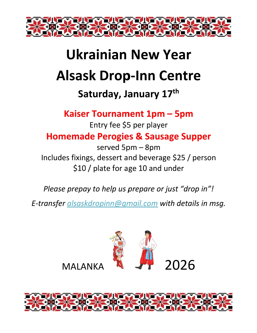 Join us to ring in 2026 in style - Ukrainian style starting with a Kiaser tournament at 1:00 p.m. with $5/person entry fee and cash prize. Then starting 5:00 - 9:00 p.m. supper will be served featuring homemade perogies, sausage and vegetables for $25/plate. Come share in the fun and support the Alsask Drop-Inn Centre.