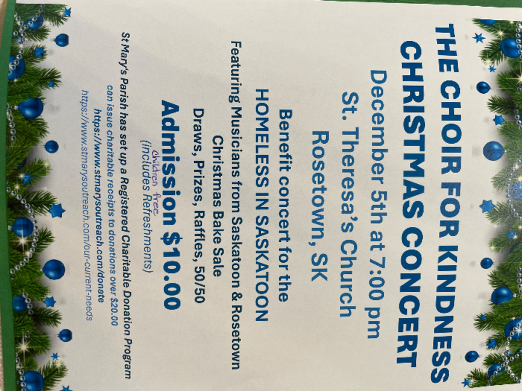 A benefit concert for the homeless in Saskatoon featuring musicians from Saskatoon and Rosetown.