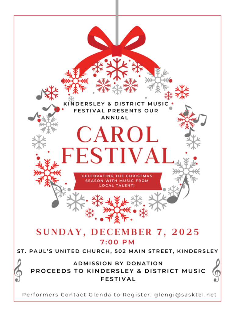 The community is welcome to come and listen to a variety of musicians performing songs of the season at the annual Carol Festival! Admission is by donation, proceeds to Kindersley & District Music Festival.