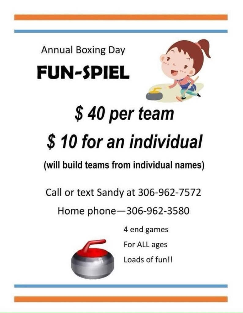 Families in Eston are invited to lace up their curling shoes and join the annual Boxing Day fun spiel. The event is open to both individuals and teams, with registration costing $40 per team or $10 for a single participant. Participants can register by contacting Sandy Sutherland at 306-962-7572.