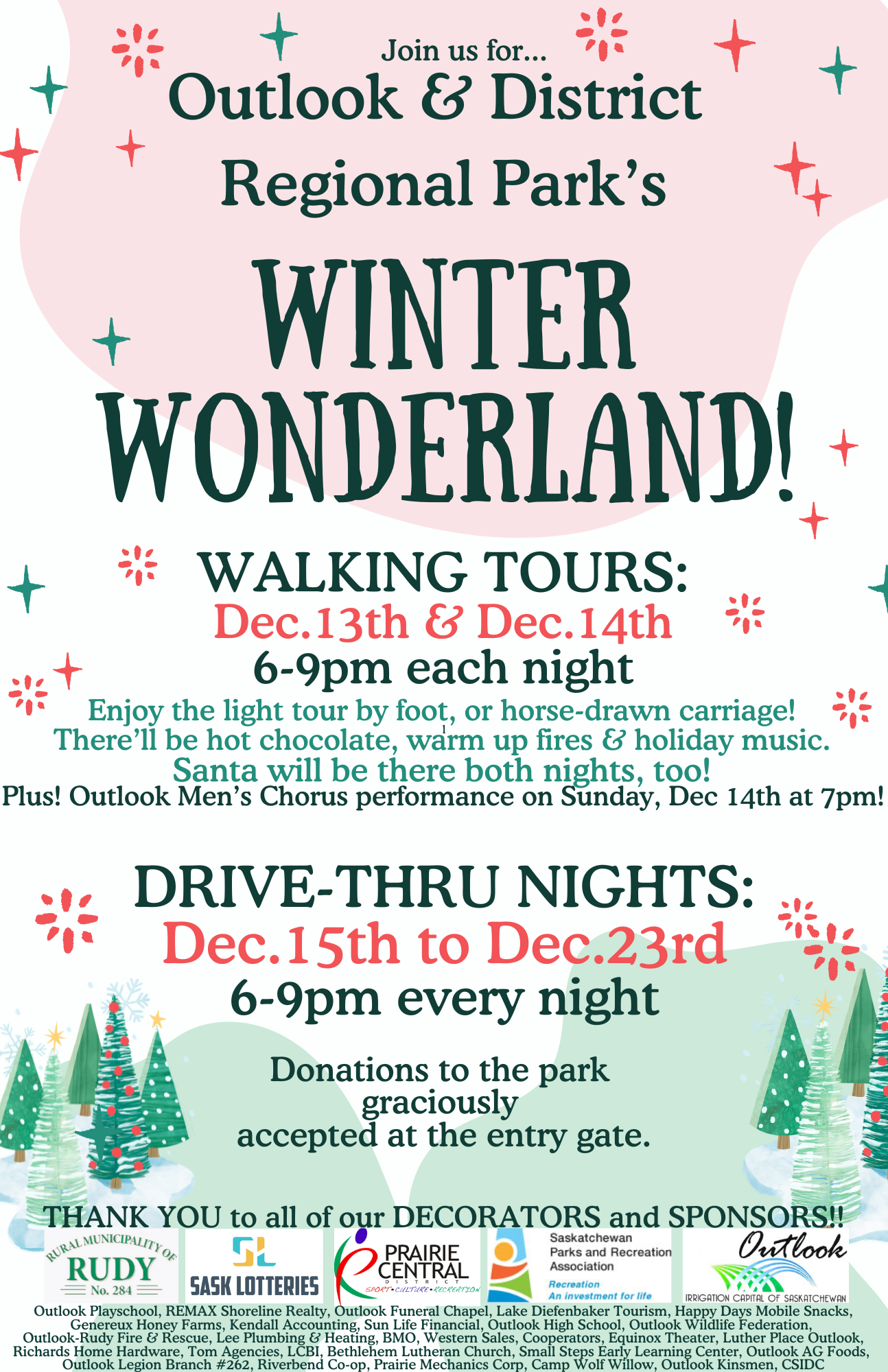 Visit Outlook & District Regional Park this holiday season for a fantastic festive light display! Local businesses, clubs, groups and schools will be decorating the park's campsites to their hearts delight, and it gets super bright!!