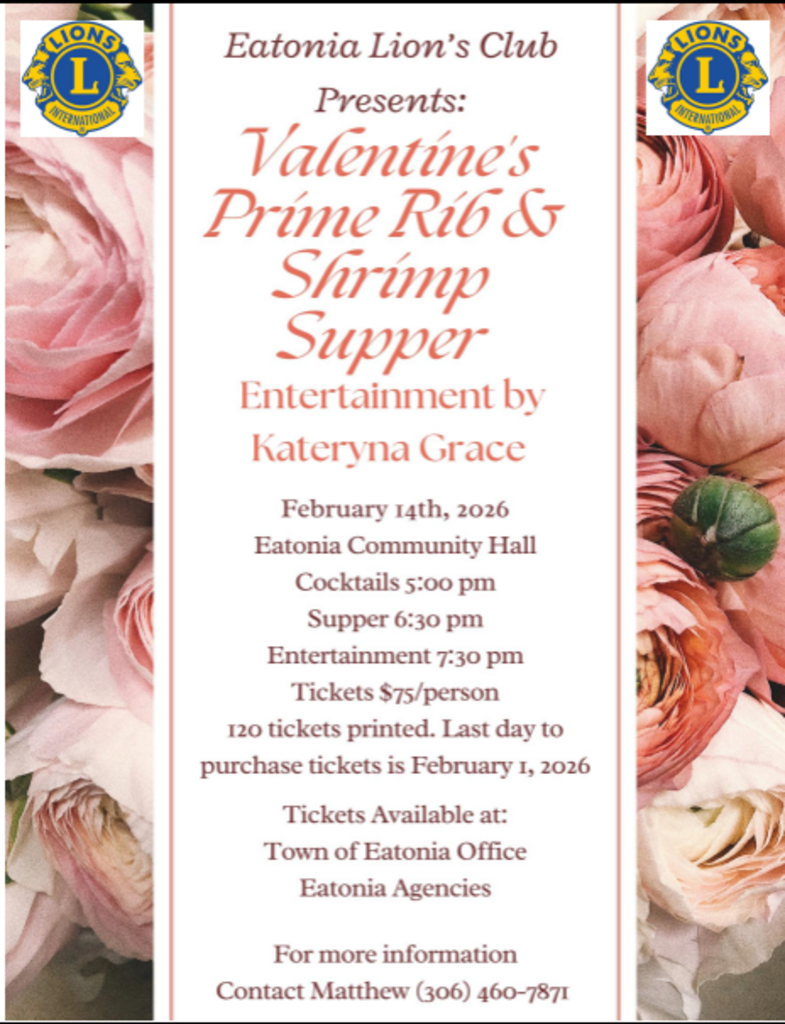 Tickets for the Valentine’s Supper are $75 per person, with only 120 available. The last day to purchase is Feb. 1, and tickets can be obtained at Eatonia Agencies or the Town Office.