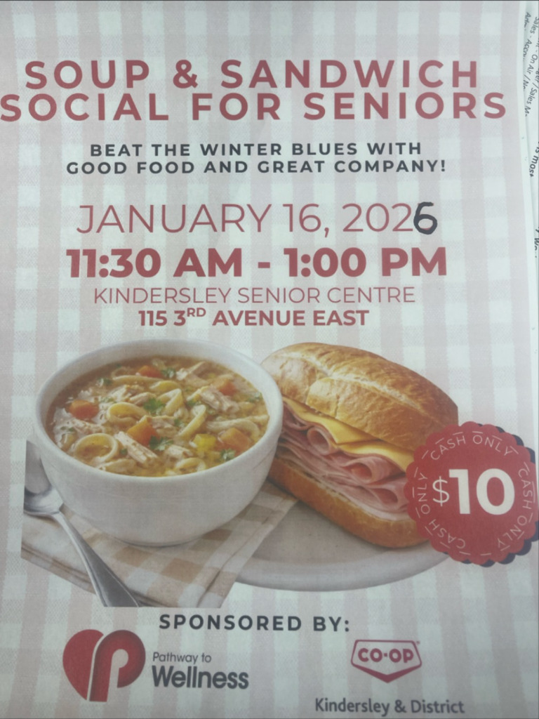 Beat the winter blues with good food and great company. Soup and sandwich social for seniors at the Kindersley Senior Centre. Sponsored by Pathway to Wellness and Kindersley Coop. Price is $10