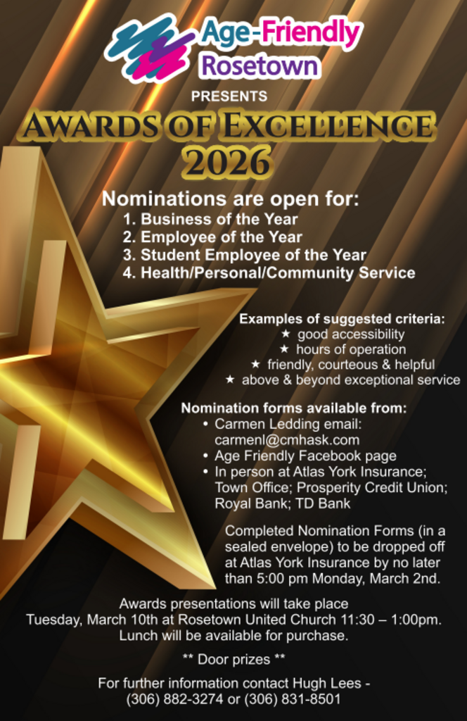 Nomination forms are available from the Age Friendly Facebook page or in person at Atlas York Insurance, Rosetown Town Office, TD Bank, Royal Bank, or Prosperity Credit Union.