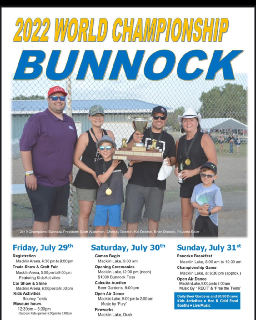 After a three year hiatus, the largest bunnock tournament in the world returns to the Town of Macklin. The fun begins with a Car Show & Shine on Friday, July 29 from 6:30 pm to 9:00 pm. The games begin at the Macklin Lake Regional Park at 9:00 am Saturday, July 30. There is also a pancake breakfast from 8:00 am to 10:00 am Sunday, July 31.